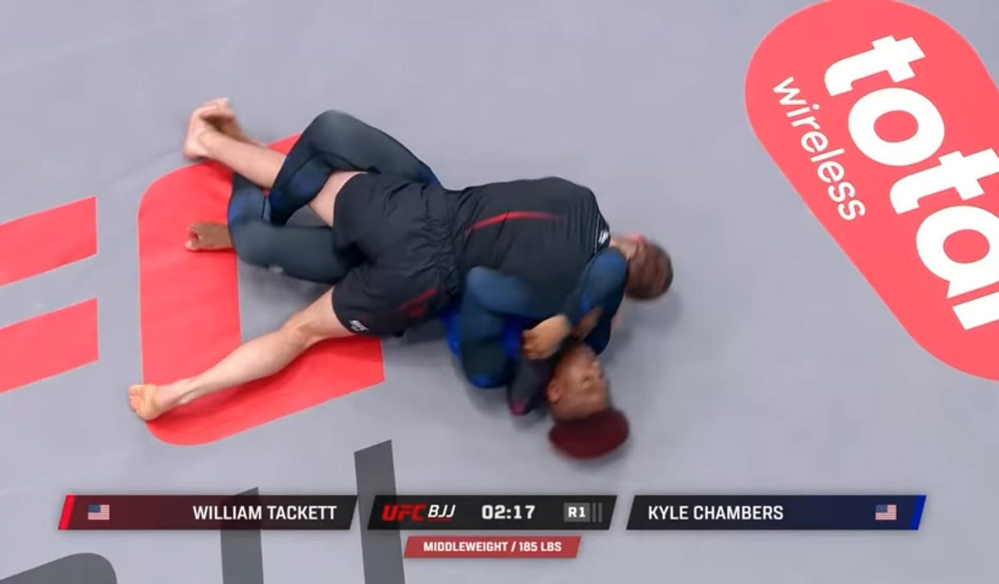 William Tackett is one of my favorite grapplers to watch because he has the scrambling ability of someone like his brother Andrew Tackett or the Ruotolo brothers, while also being extremely methodical, like Gordon Ryan. He’s the full package — and he showed that in this match against Kyle Chambers.